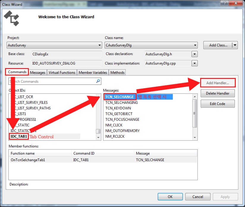 [MFC] 버튼클릭으로 탭 전환하기 [메인다이얼로그] 1. 탭 컨트롤 변수 선언 (m_KingTab) 2. 각각의 탭 컨트롤 변수 선언 (m_tab1, m_tab2, ... ) 3. 탭 연동 4. 현재 탭 저장할 탭 포인터 변수 선언 (m_pwndShow) 탭 입장에선 부모는 tab control이고 한번 더 부모를 타면 MainDlg 일 것이다. 버튼이 있는 탭에서 버튼에 대한 함수를 아래와 같이 정의한다. void Tab1::OnBnClickedButtonNext() { //TODO: Add your control notification handler code here //tab1의 부모는 tabControl임. 한번 더 부모를 가져와야 CYourMainDlg. CYourMainDlg* pMainDl..