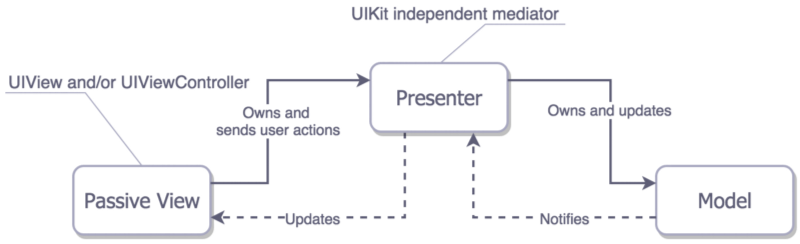 iOS 아키텍처 패턴 - VIPER 원문 출처 : https://medium.com/ios-os-x-development/ios-architecture-patterns-ecba4c38de52 마지막 주자 VIPER는 MV(X) 카테고리가 아니라는 점이 흥미롭다. 이제는 책임 분배가 얼마나 중요한 지에 동의할 것이다. 레고 빌딩 경험이 iOS 앱 디자인에 반영되었다. VIPER는 기존의 MV(X) 패턴들과 다르게 3가지 카테고리가 아니라, 2가지 더 추가되어 총 5가지 카테고리를 가진다. * Interactor : data(Entities) 또는 networking과 관련된 business logic을 포함한다. (Entities의 새로운 instance를 만든다던지, 서버로부터 이들을 fetching 한..