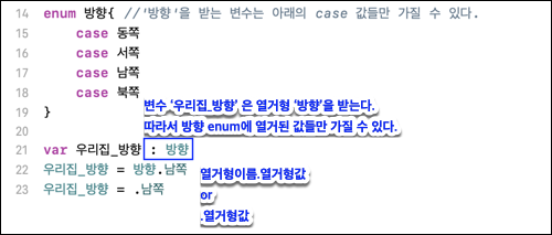Swift 열거형 (Enum) : 변수가 가질 수 있는 값들을 나열해 놓은 타입. : 값의 종류가 일정 범위로 정해져 있는 경우 적합. 열거형 형식 enum 열거형이름{ case 가능값1 case 가능값2 case 가능값3, 가능값4, 가능값5 } 예시 변수가 열거형을 받는 방식은 선언 시 변수명 옆에 : 열거형이름 을 명시하면 된다. var 서울에서거제 : 방향 열거형을 받은 변수는 열거형에 나열된 값만 가질 수 있다. 원시값(raw value) C언어에서는 default로 열거형 자료에 정수형으로 숫자를 부여한다. Swift 에서는 기본적으로 사용하지 않는다. 사용하고자 할 때에는 열거형명 : Int 이렇게 따로 명시해야 한다. : Int를 적어 정수형 rawValue를 사용함을 명시했다. 첫번째 c..